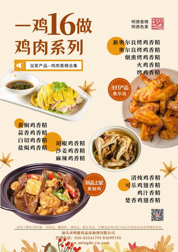 有 雞汁香精、燉雞香精、白切雞香精、蒜香雞香精、鹽焗雞香精、胡椒雞香精、麻辣雞香精、可樂(lè)雞翅香精、煙熏烤雞香精、火雞香精、煙熏烤雞香精、奧爾良烤雞香精、沙姜雞香精等等,諸如此類,各有特色。歡迎有興趣的廠家朋友們了解咨詢~