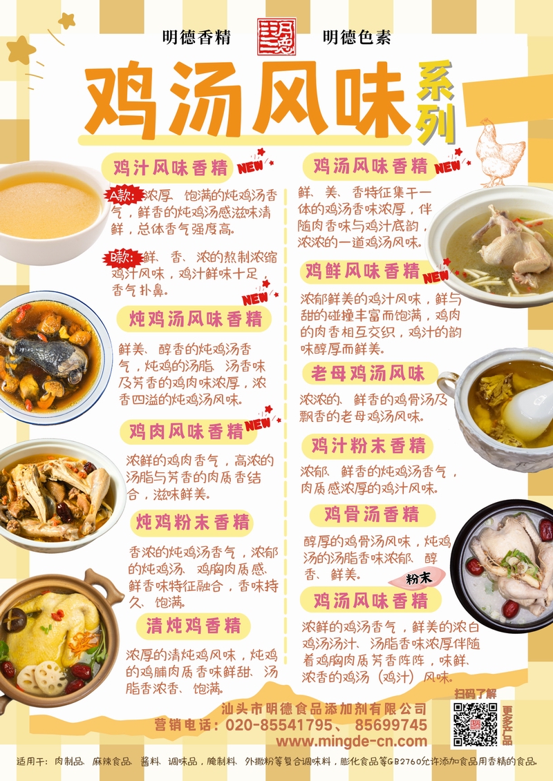明德雞湯風(fēng)味香精 濃郁鮮香 還原地道雞湯本味汕頭市明德食品添加劑有限公司的雞湯風(fēng)味香精系列,涵蓋雞汁、雞湯、雞鮮風(fēng)味、老母雞湯、雞肉風(fēng)味、雞粉末、雞骨湯、清燉雞等多種品類。產(chǎn)品具備真實(shí)的雞肉鮮香、湯香、油香與骨香特征,能夠?yàn)獒u料、調(diào)味品、肉制品、腌制料及復(fù)合調(diào)味料等B端應(yīng)用提供穩(wěn)定、濃郁的雞湯風(fēng)味解決方案,幫助工廠快速打造風(fēng)味醇厚、回味悠長的雞香產(chǎn)品。
